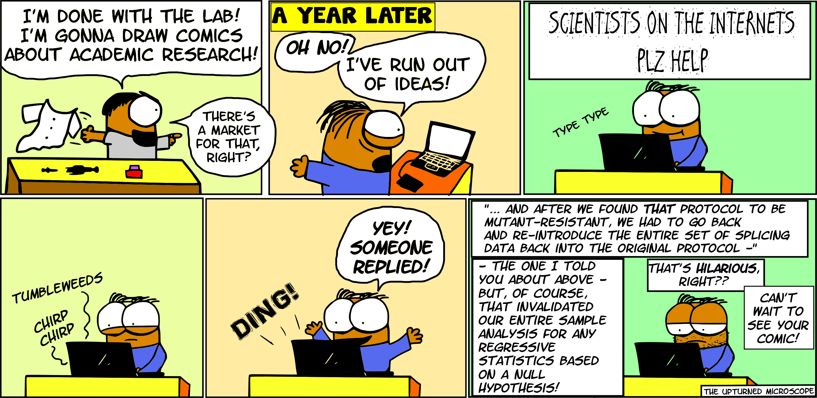 Chemistry World interviewed me for their new article, The Art of Science, and asked me to draw a comic about my experiences as a science cartoonist. Their editor is brilliant and wisely didn’t let me go with my first instinct, which was not as, uh, “happy” as this.