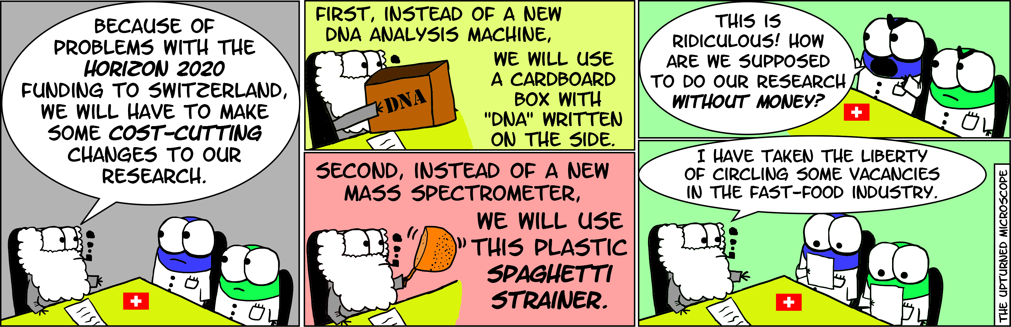 I have the privilege of drawing a comic strip for EPFL’s monthly magazine, FLASH. This is the one I drew following the Swiss immigration referendum (9 Feb 2014), which created a lot of obstacles for EU-funded research in the country.