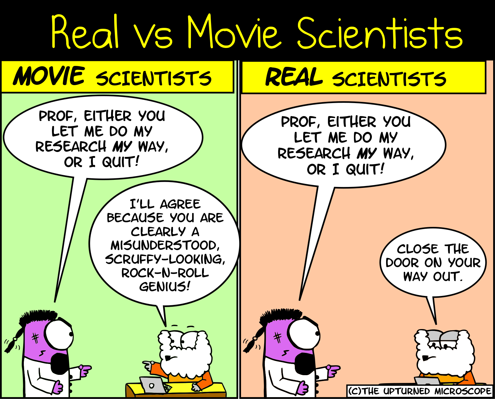 Movie vs Real Scientists October 18, 2015 Follow The Upturned Microscope on Twitter and Facebook! Share this: Click to share on Facebook (Opens in new window) Facebook Click to share on X (Opens in new window) X Click to share on Reddit (Opens in new window) Reddit Click to share on WhatsApp (Opens in new window) WhatsApp Click to share on LinkedIn (Opens in new window) LinkedIn Click to share on Tumblr (Opens in new window) Tumblr Click to share on Pinterest (Opens in new window) Pinterest Click to share on Pocket (Opens in new window) Pocket Click to email a link to a friend (Opens in new window) Email Click to print (Opens in new window) Print Like Loading... Related
