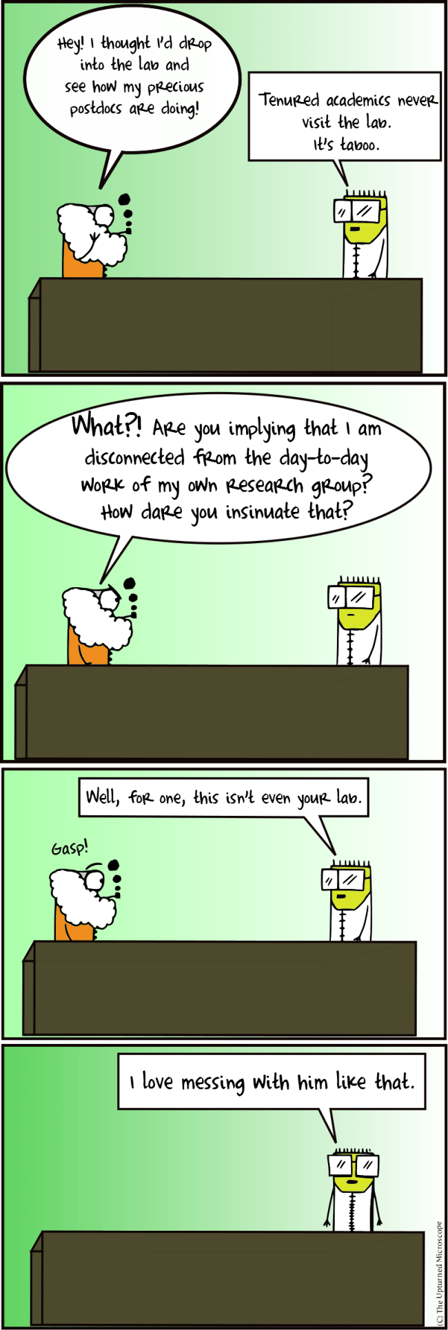 That’s when my elusive supervisor walks in – first time I’ve seen him in seven weeks – and looks at me, miserable, in my ragged lab coat, laying on the floor.