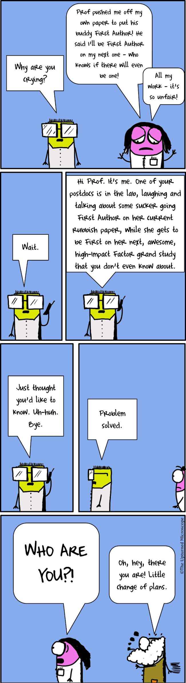 Many thanks to Lou Woodley for the idea of placing the Prof’s little girl behind the eyes. Lou actually suggested a kid daughter, but, given the Prof’s age, I thought a grand-daughter was more realistic. Especially since, you know, the biological life-cycle of cartoon blobs closely resembles the human one. Seriously. I’m going to publish a paper on it real soon.